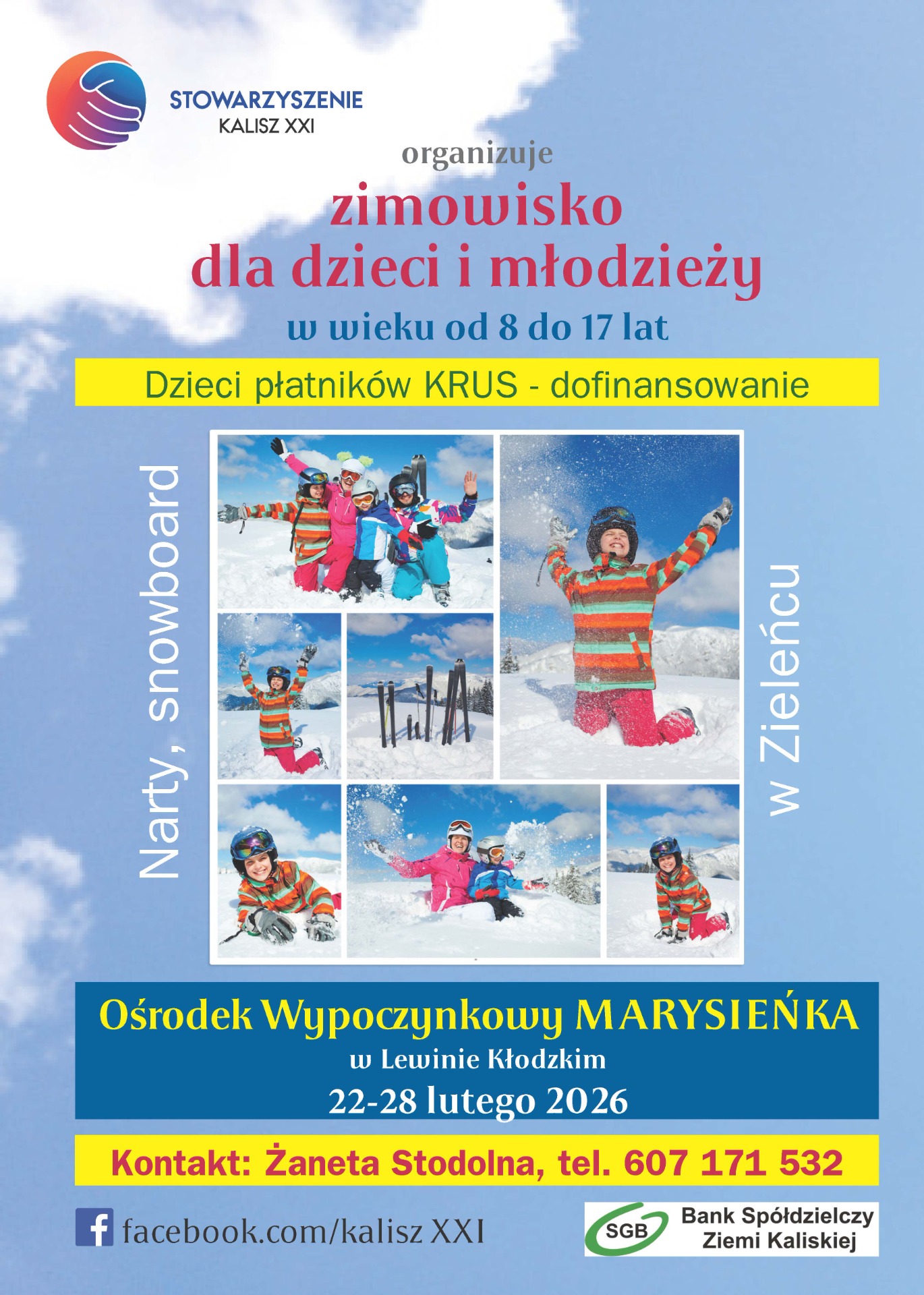 Stowarzyszenie KALISZ XXI, tak jak w poprzednich latach, jest organizatorem tegorocznego zimowiska w Lewinie Kłodzkim. Zapraszamy do udziału w nim dzieci i młodzież w wieku 8 – 16 lat, których jedno z rodziców lub opiekunów prawnych jest płatnikiem składki KRUS.