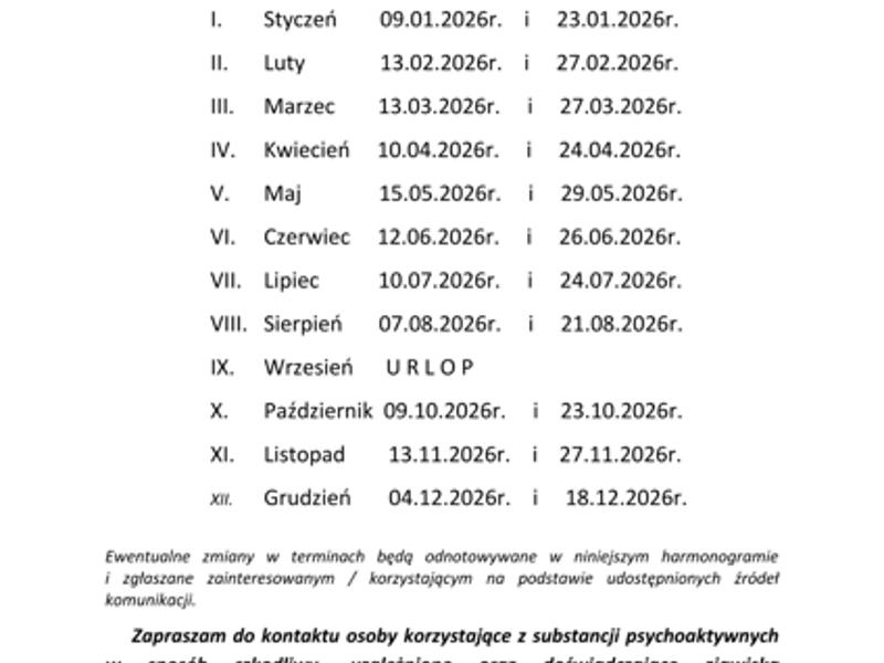 Harmonogram przyjęć psychologa I półrocze 2026r.