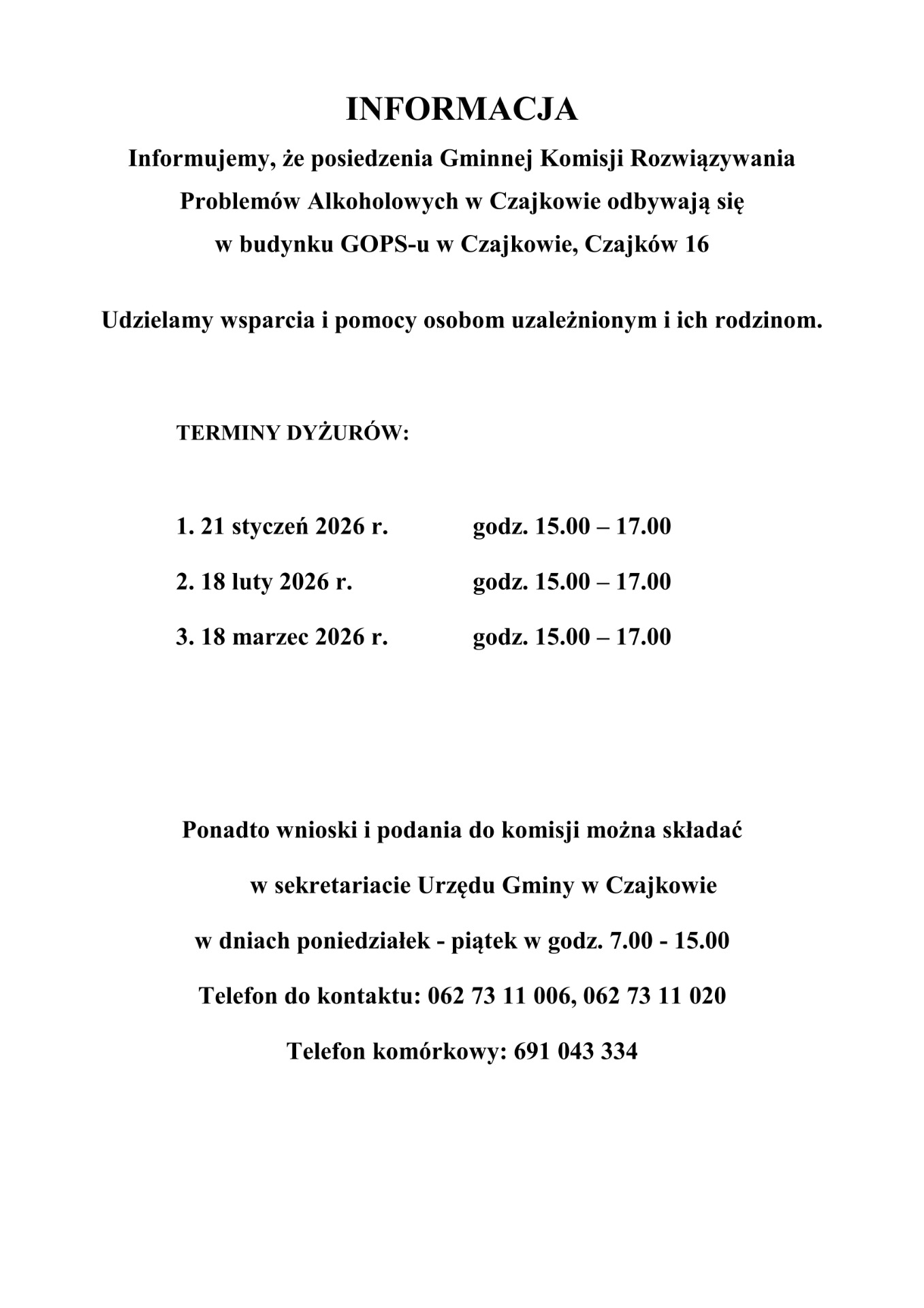 Informacja o posiedzeniach Gminnej Komisji Rozwiązywania Problemów Alkoholowych w Czajkowie